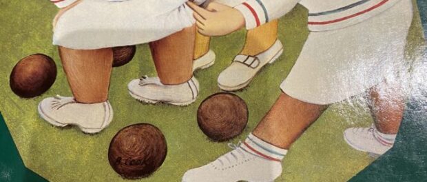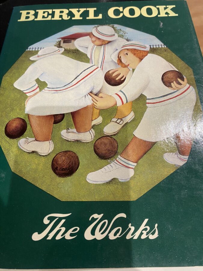I remember her but not the production. In the interval we wondered around the NT bookshop and were struck by the cover of  a book called ‘THE WORKS” by Beryl Cook. Its cover – of two well-rounded ladies playing bowls – particularly amused us. One was bending over and the other sticking her finger into the thrower’s large behind.  In fact it amused us so much that we could hardly contain our mirth. I bought the book and inscribed it thus: ‘I will remember the evening always’.